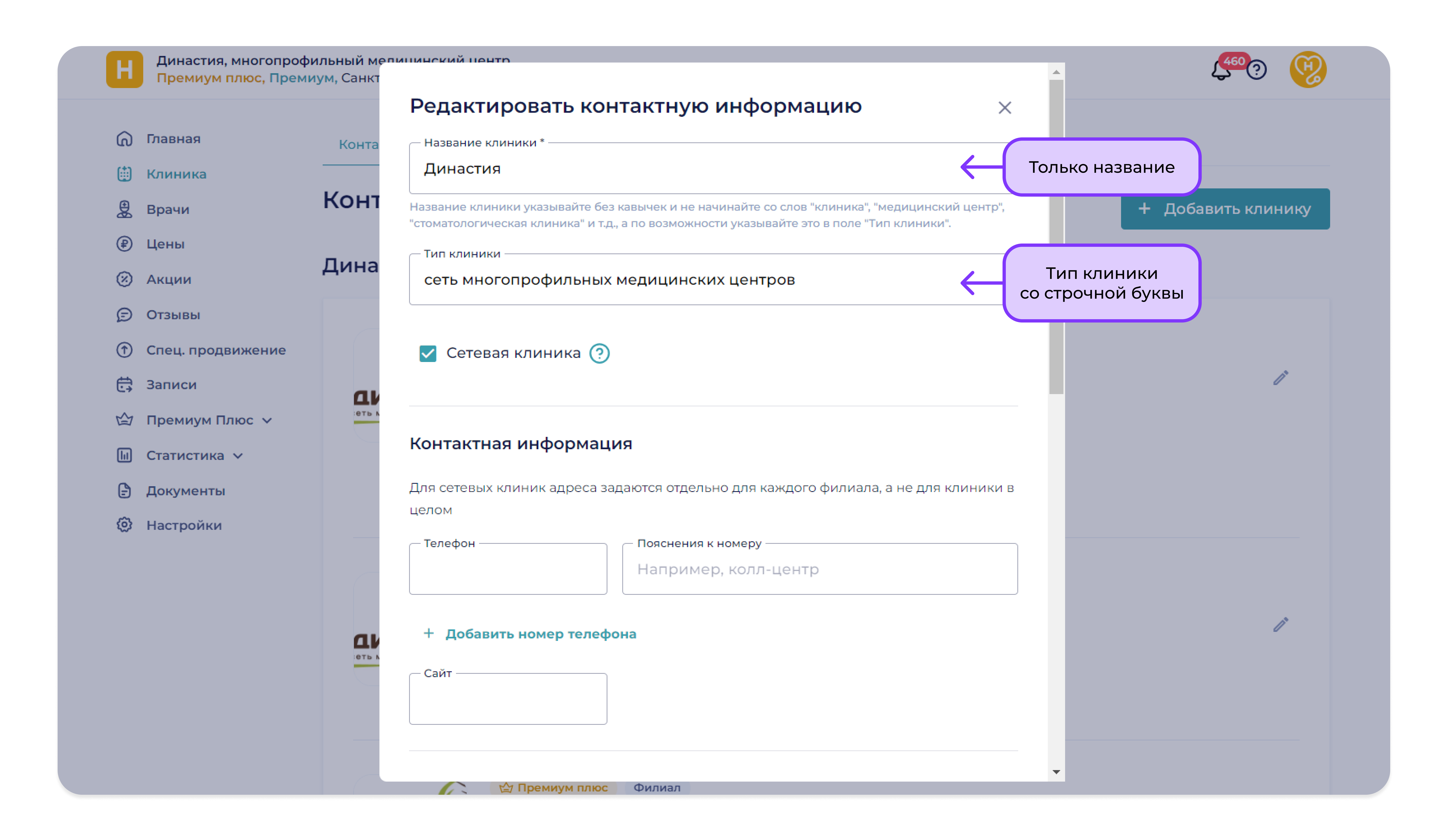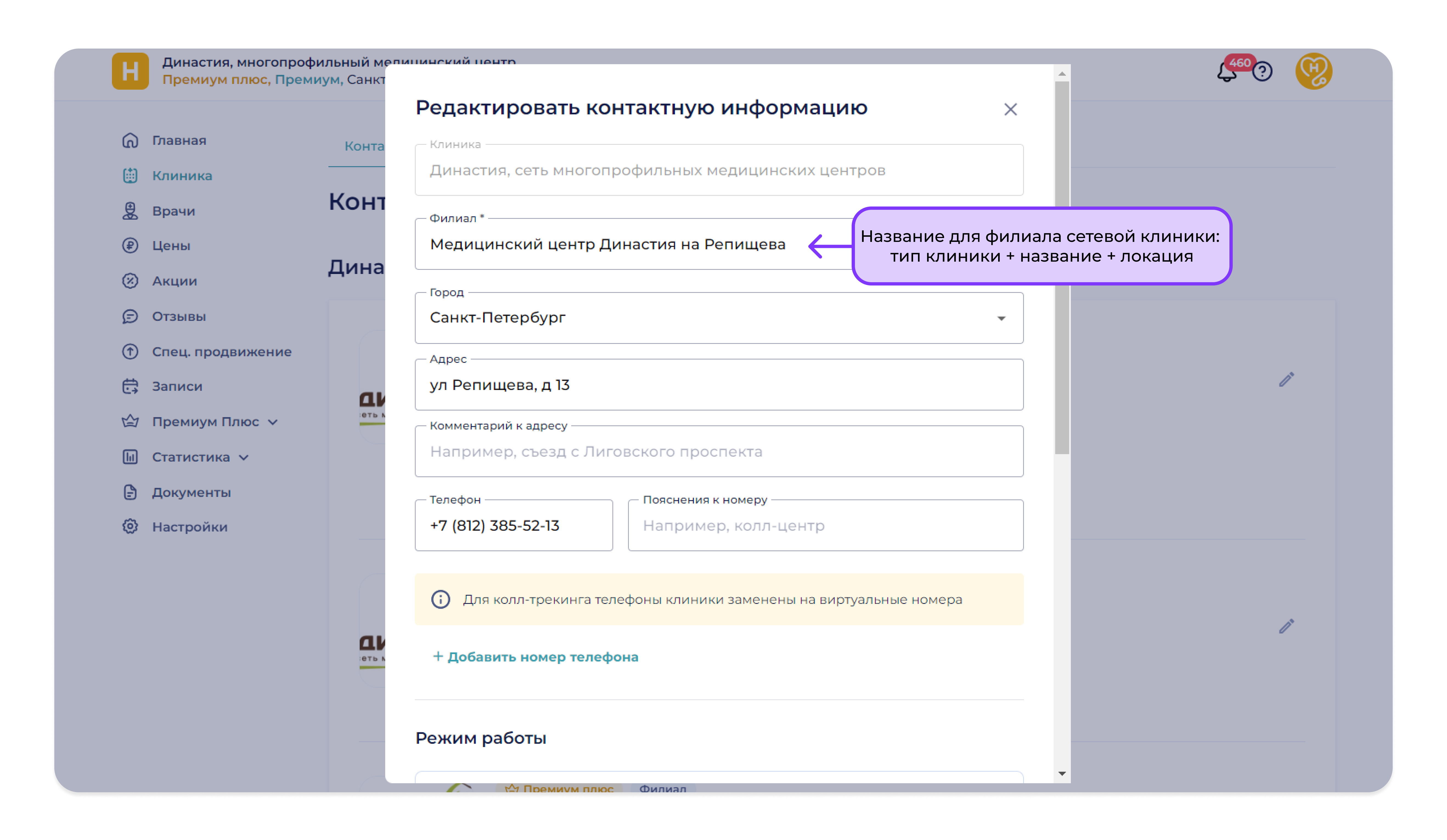6. Введите номер телефона. Обратите внимание: на страницах клиник на Премиум-продвижении пациенты видят подменный номер телефона, чтобы мы могли отследить звонок и зафиксировать запись. Если ваша клиника продвигается у нас и вы хотите изменить номер, на который идёт переадресация звонков, напишите вашему персональному менеджеру или на почту [email protected].