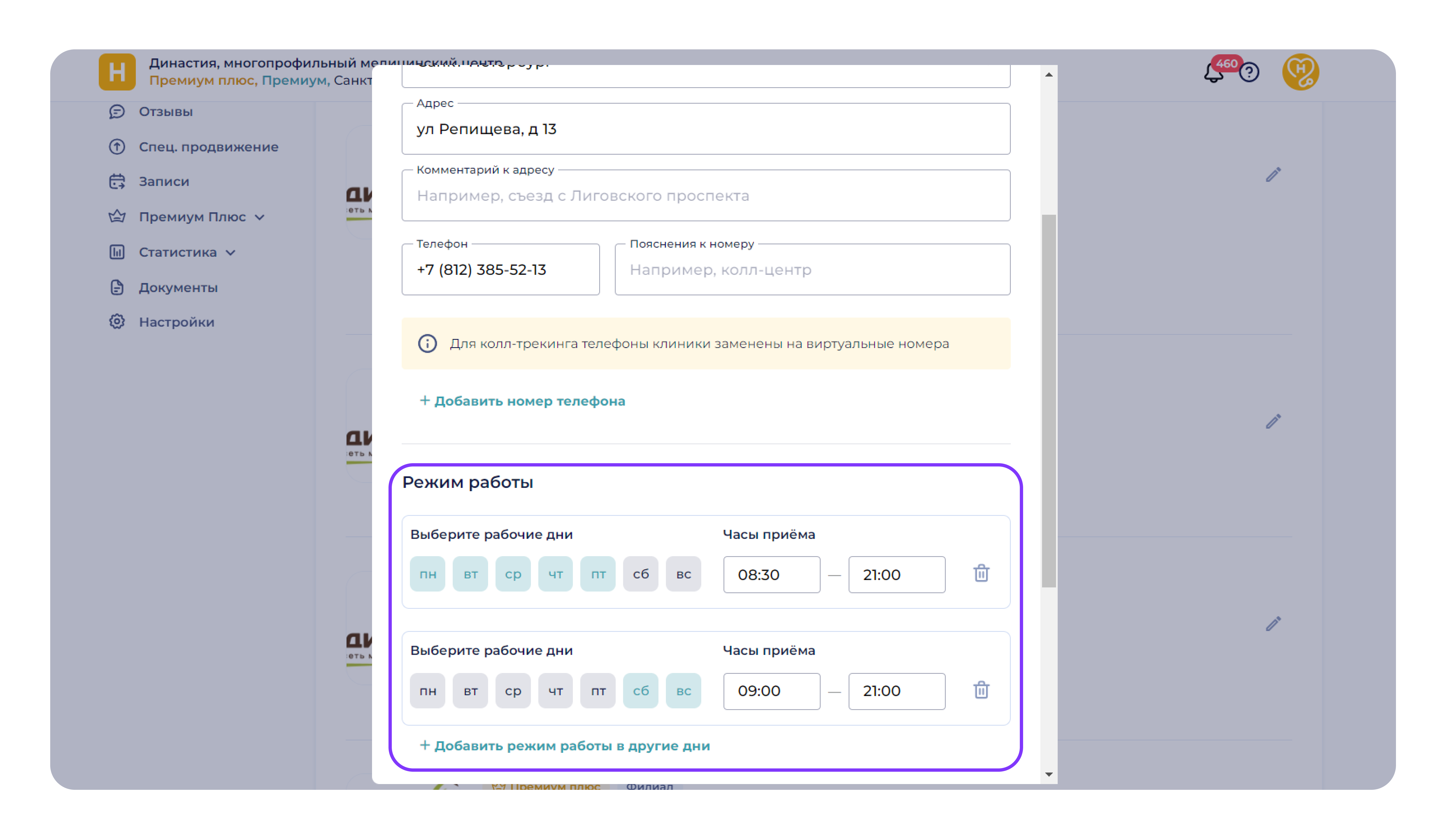 7. Укажите часы работы клиники: вы можете выбрать разное время для разных дней.