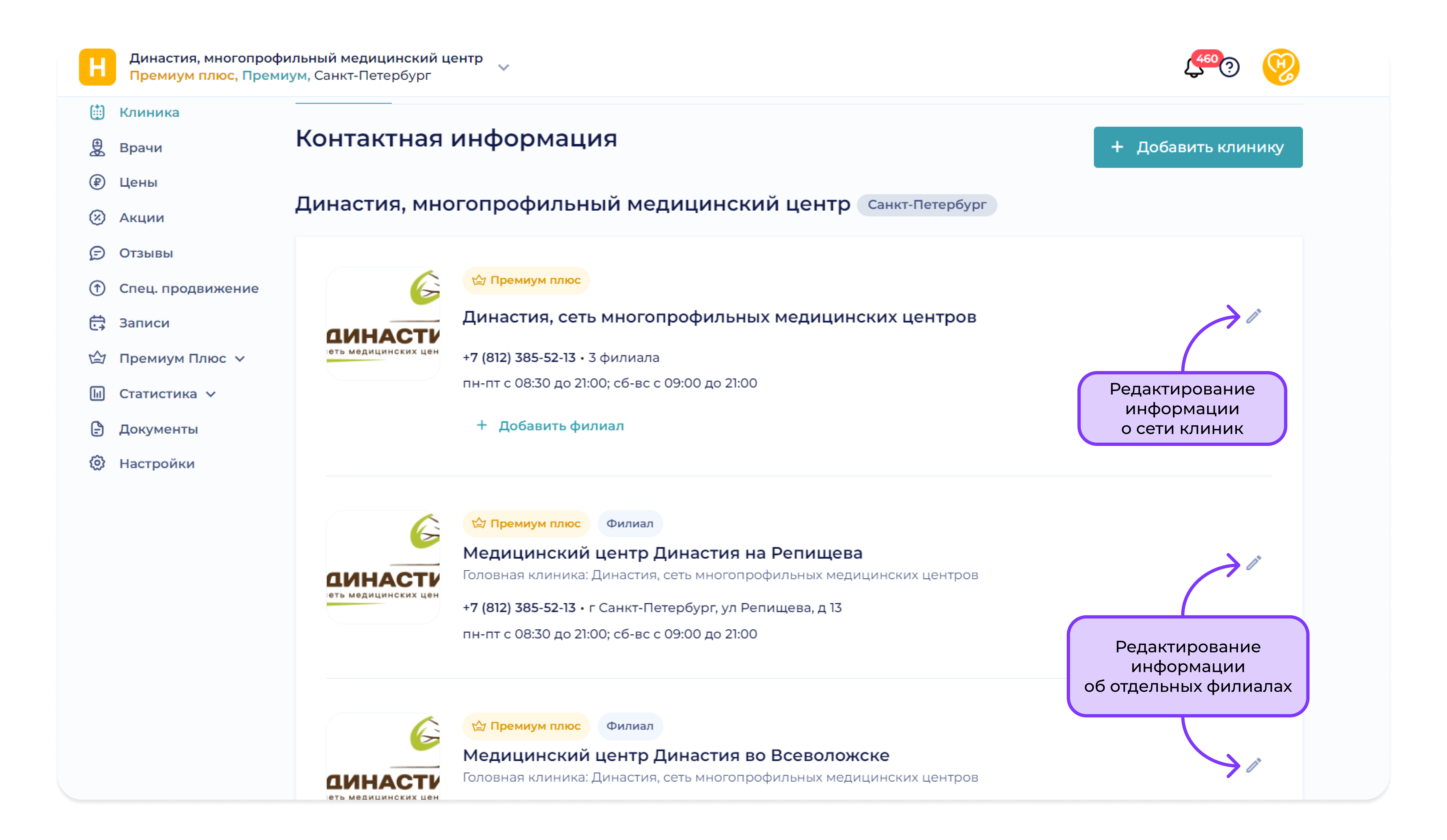 2. Чтобы отредактировать контакты всей сети клиник, нажмите на иконку карандаша ✎ рядом с названием сети. Чтобы отредактировать контакты отдельного филиала, нажмите на иконку карандаша ✎ рядом с названием филиала.