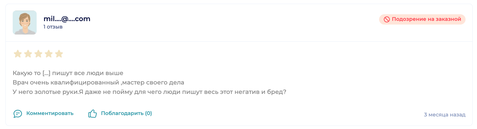 Если модераторы признали отзыв недостоверным, он не удаляется, а размещается на сайте с пометкой «Подозрение на заказной». Это правило работает в интересах пациента и честной конкуренции. Такие отзывы понижают рейтинг клиники, и это мотивирует отказаться от фальсификации.