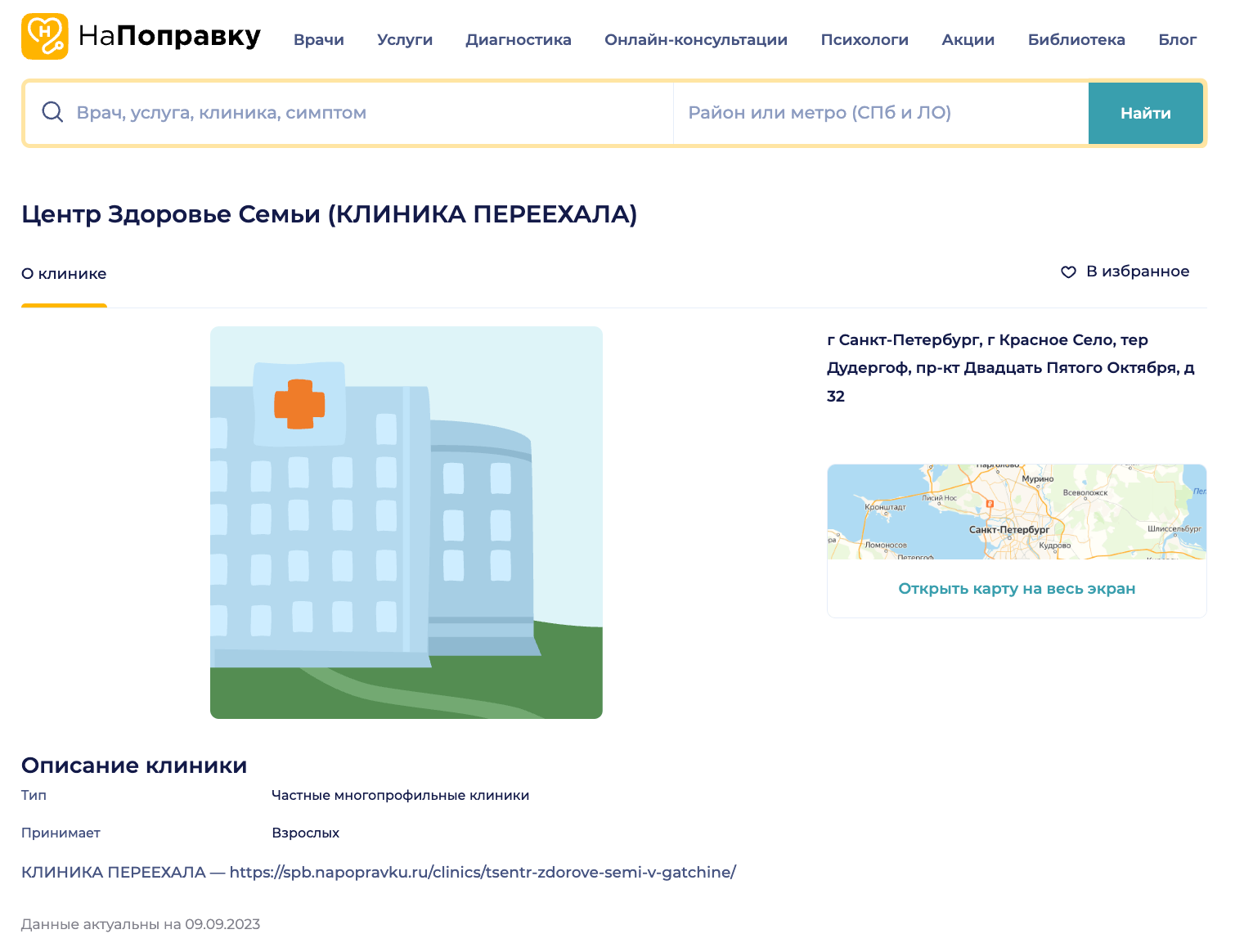 Вместо этого мы ставим пометку «Клиника переехала» и оставляем ссылку на новый профиль клиники с актуальным адресом.