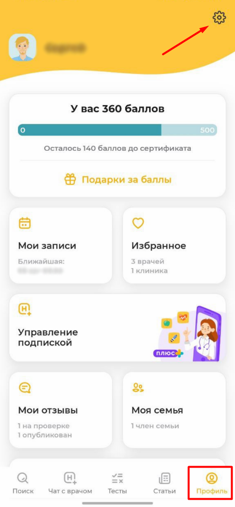 Перейдите в раздел «Профиль» и нажмите «Шестерёнку» в правом верхнем углу экрана:
