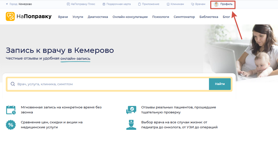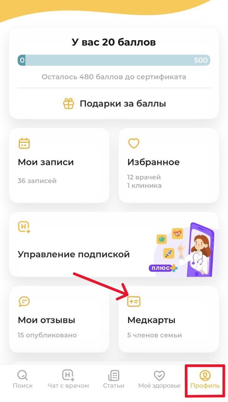 • Зайти в раздел «Профиль» → «Медкарты»: