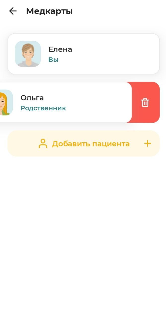 Если у вас появится необходимость удалить пациента, то достаточно потянуть его карточку влево и нажать на появившийся значок «корзины»: