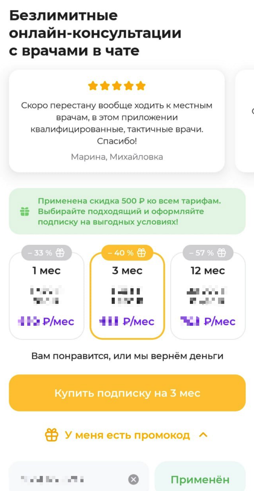 Данный сертификат дает скидку в 500 рублей на подписку на безлимитные онлайн-консультации с врачами сервиса НаПоправку.
