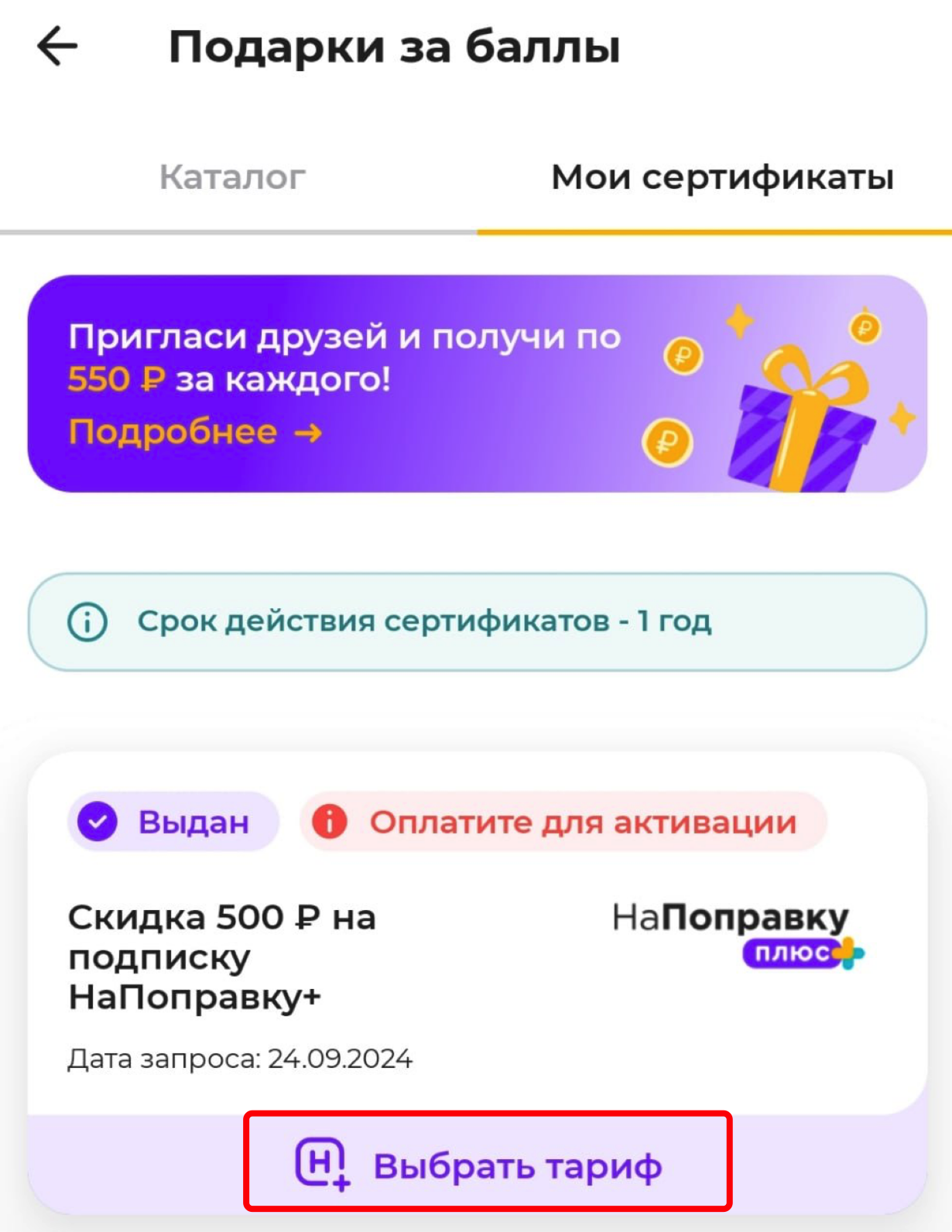 1. Перейдите в раздел "Подарки за баллы"- "Мои сертификаты" и нажмите на кнопку "Выбрать тариф"